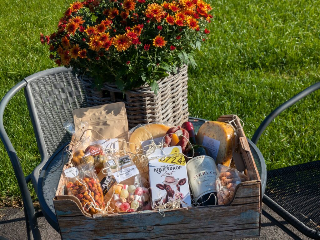 Doos groot, gevuld met jonge kaas, kruiden kaas, koek, chocolade, sap, nootjes en veluwse drop